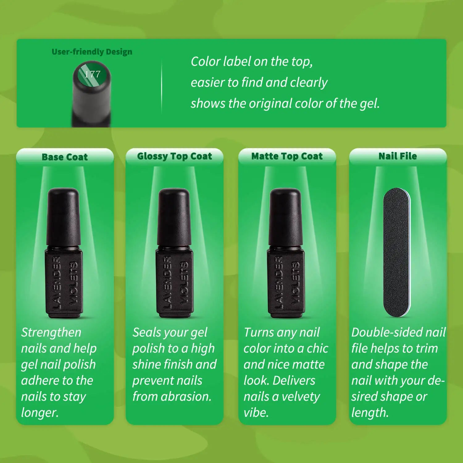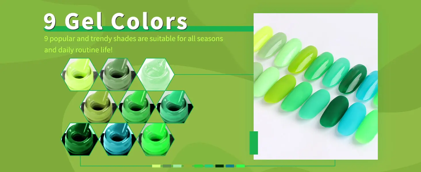 💅 Complete Nail Kit: 9 green gel polishes + base coat + glossy & matte top coats + nail file.
