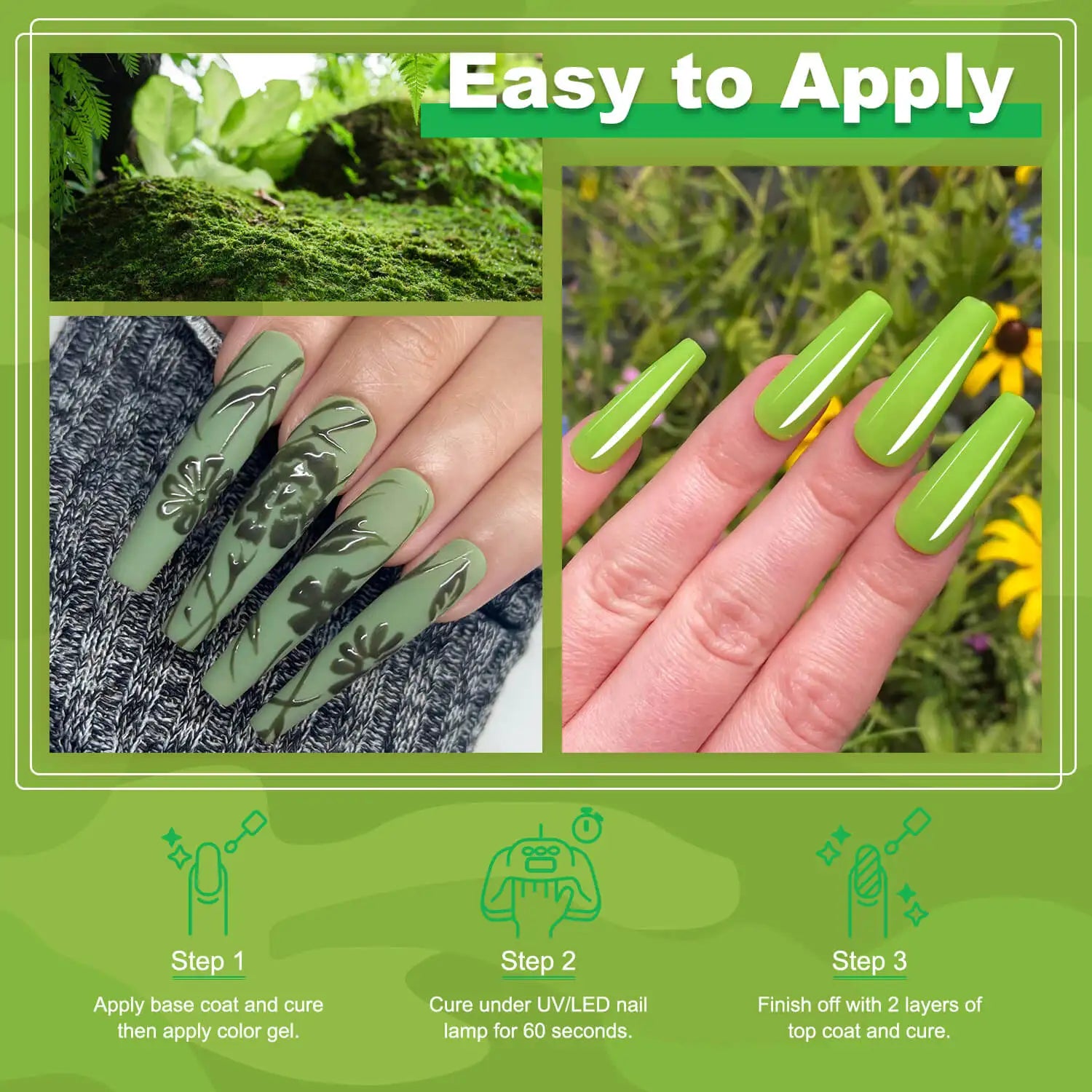 2️⃣ Apply your favorite green gel shades for glossy or matte looks.