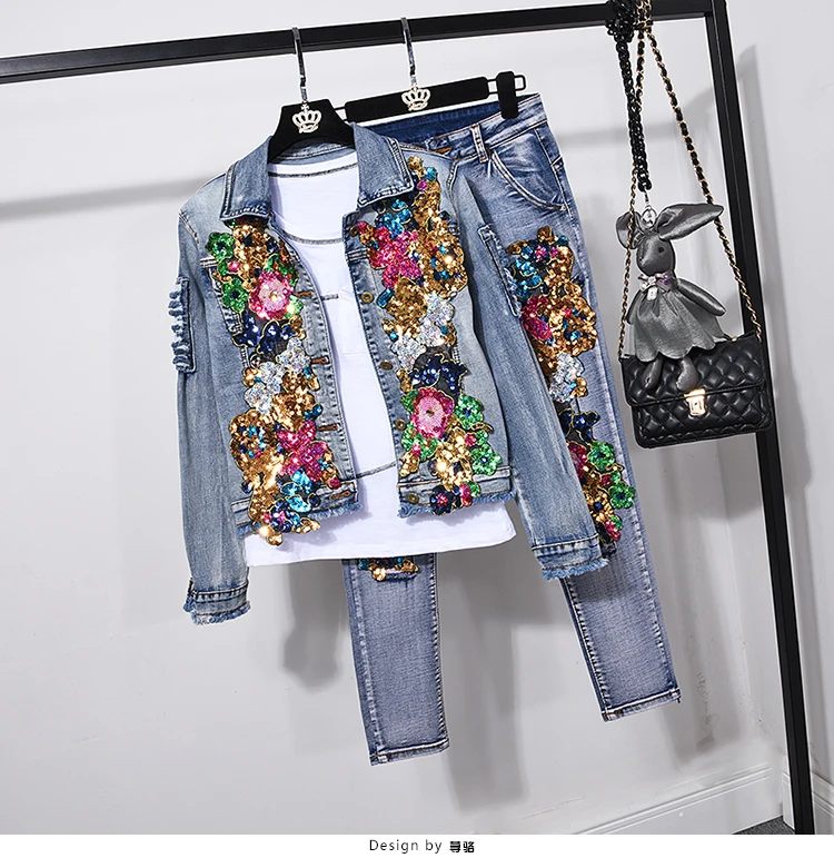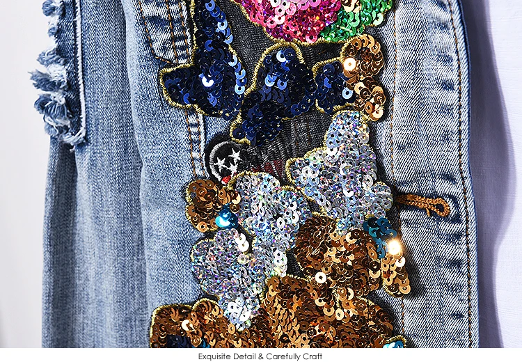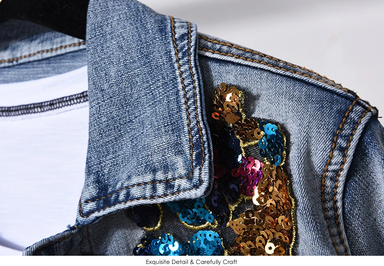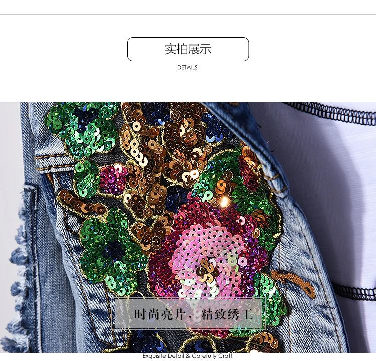 European Style Denim Jacket Fashion Outfit Women New Flower Sequined jeans Vest coat