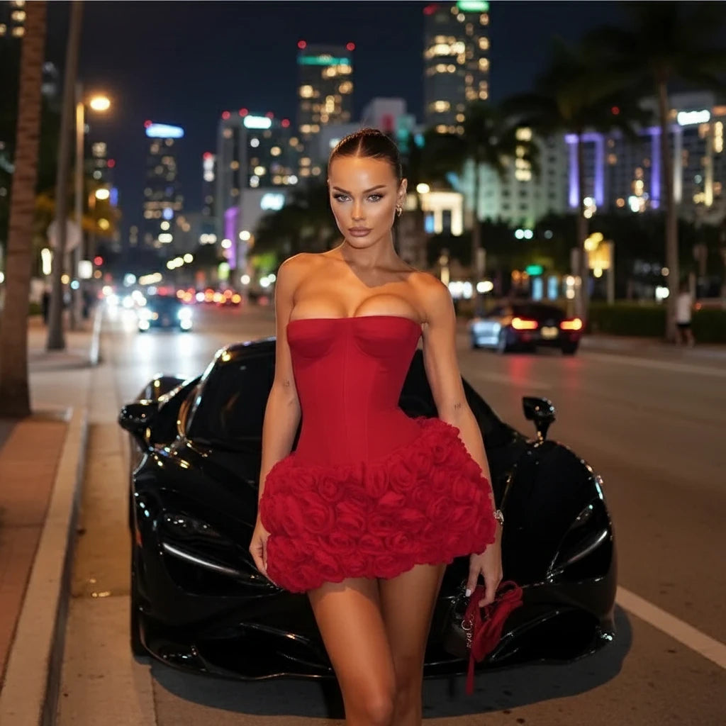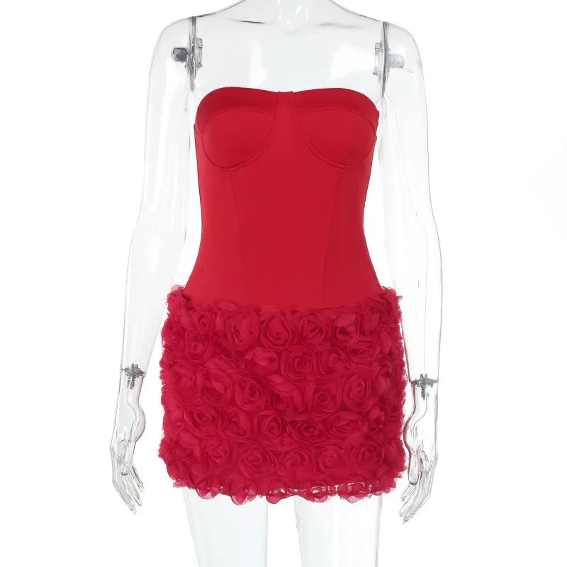 This dress features a figure flattering corseted waist that sculpts your silhouette, a wrap style hip mini skirt that adds flirty movement, and intricate 3D floral detailing for a premium, modern look. The soft, high quality fabric ensures comfort without sacrificing elegance or sexiness.