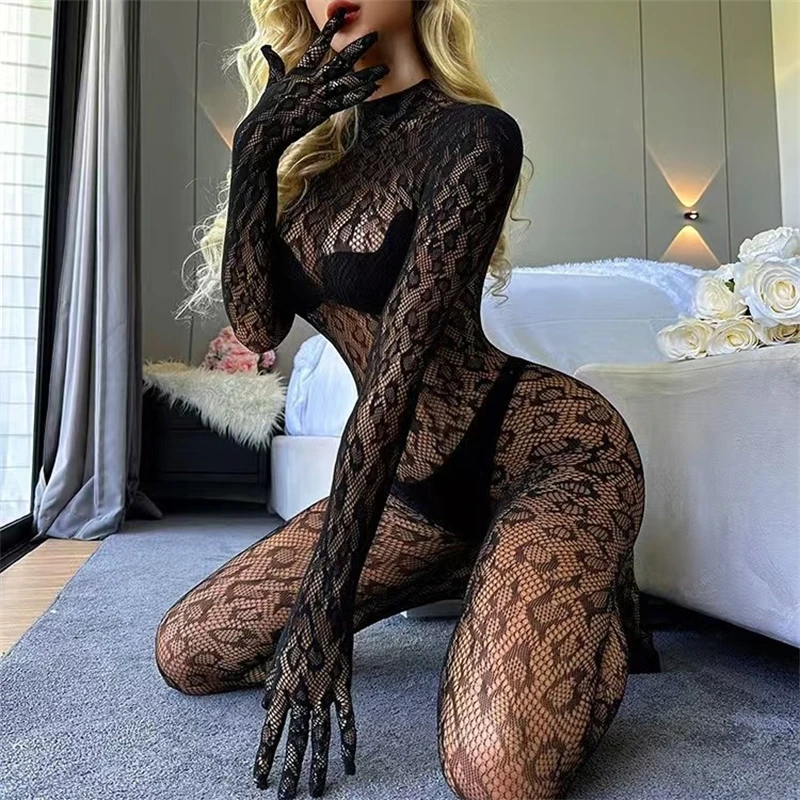 High Quality 2026 Fashion Women Sexy Leopard Hollow Out Mesh Bodystocking Fishnet Lingerie Long Sleeve See Through Bodysuit Jumpsuit Nightwear SIMPLEJEWEL