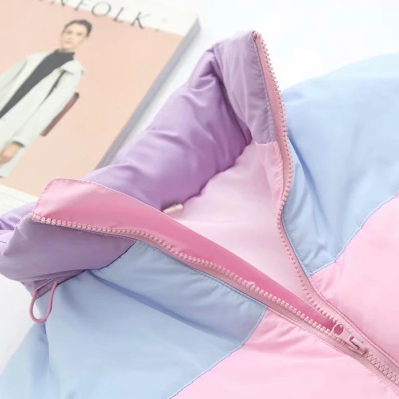Women Winter Padded Puffer Jacket Rainbow Stripes Hooded Drawstring Zipper Coat